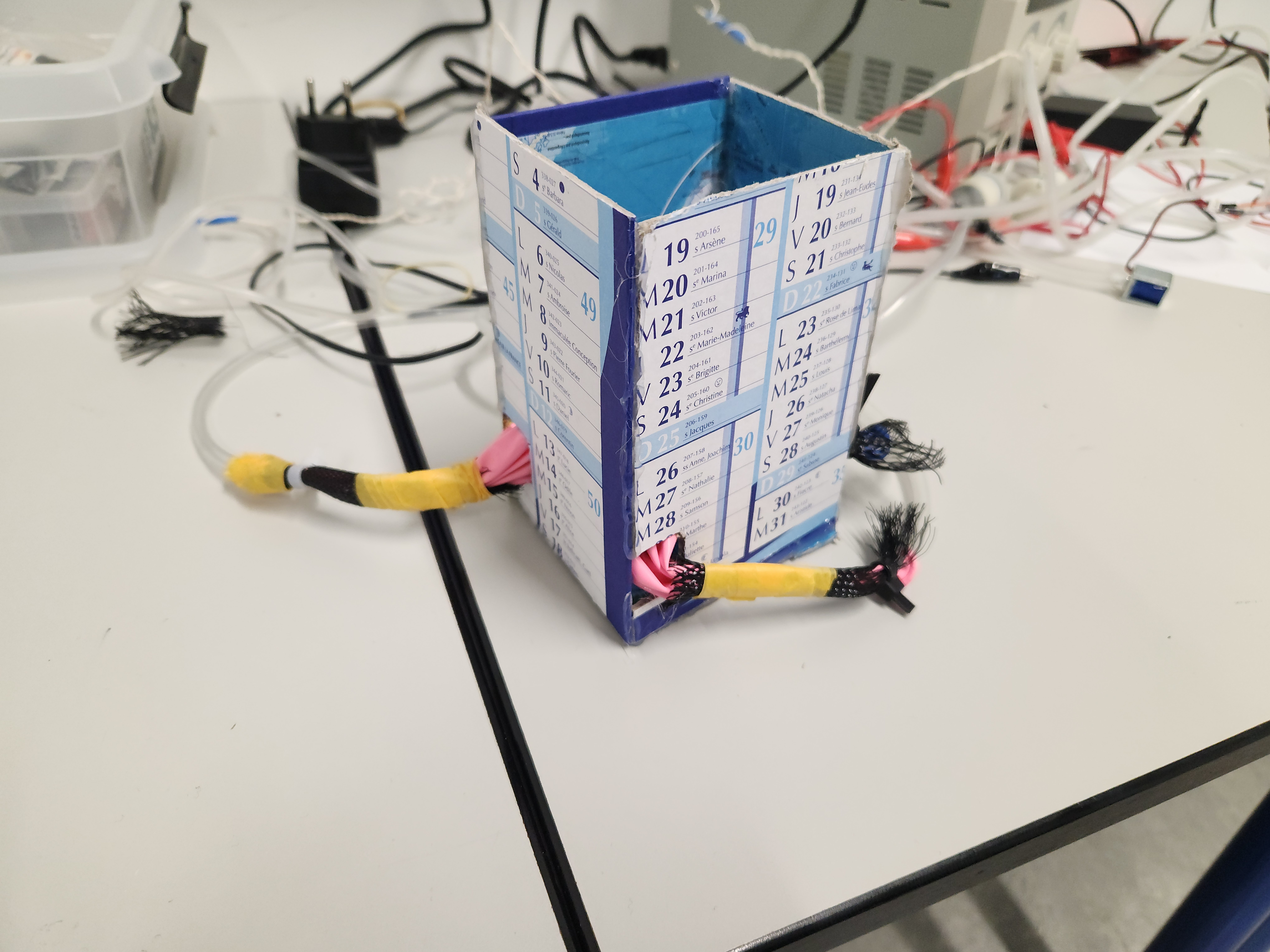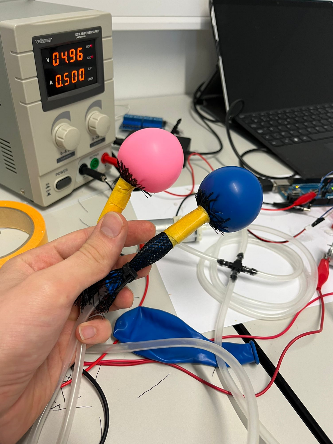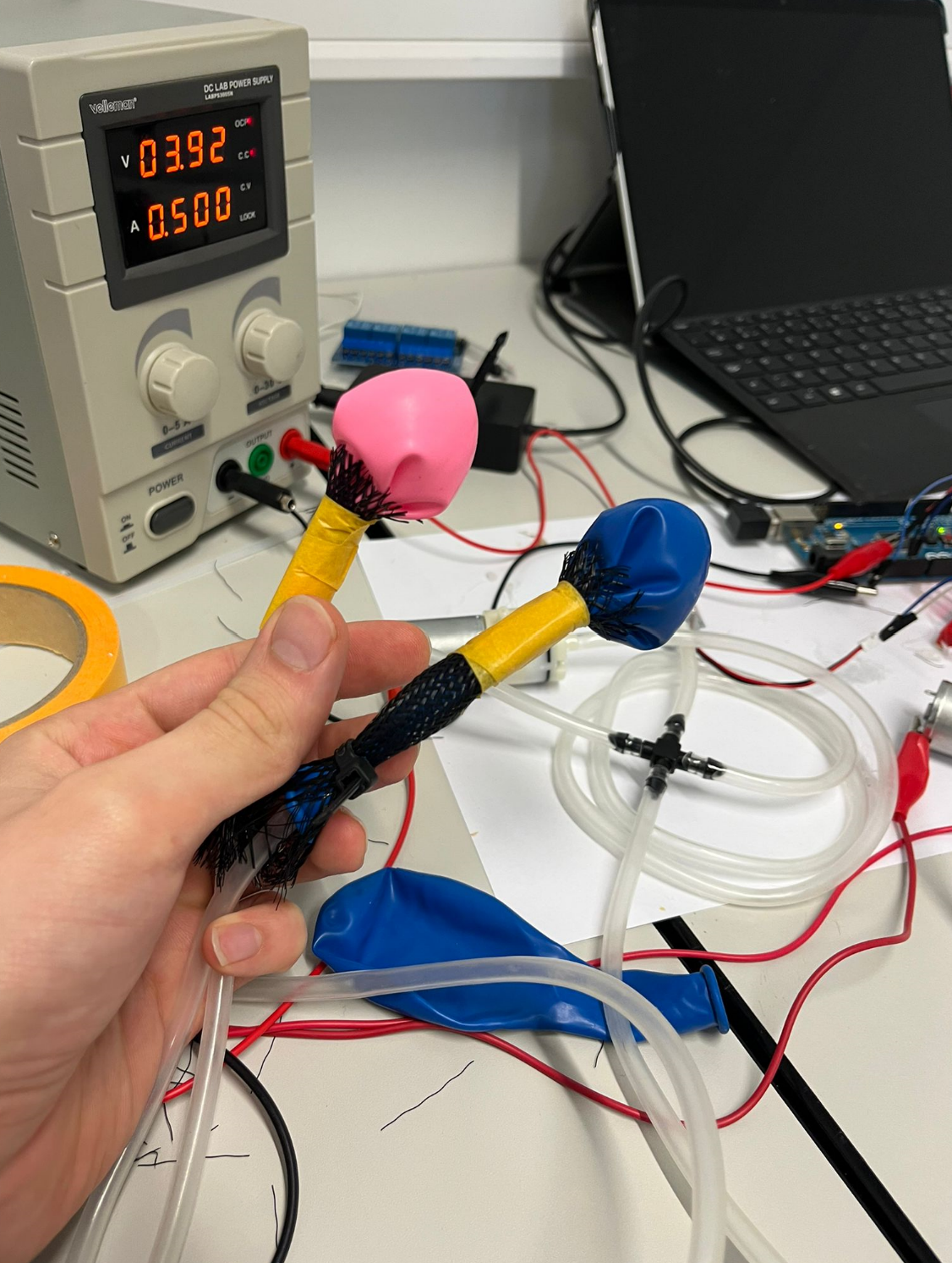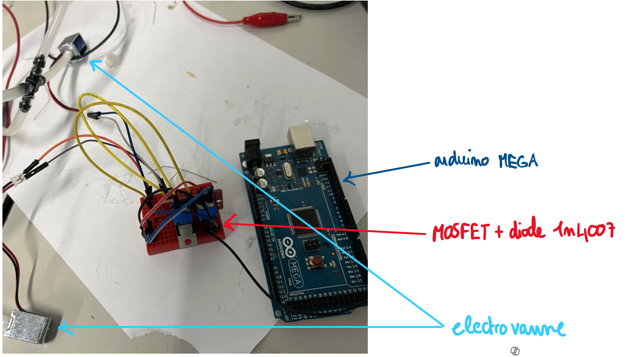 Nous avons automatisé le système grâce aux composants suivants : un transistor MOSFET, une mini électrovanne, une diode 1n4007, une carte arduino Mega, une pompe à air et un tube qui alimente le ballon dans le McKibben. Nous avons ensuite testé notre système avec 2 puis 3 puis 4 ballons. Notre soucis était maintenant la dérivation des tubes d’air : il y avait trop de ballon pour une seule pompe. Nous avons donc doublé notre montage avec 2 pompes et 2 électrovannes pour faire deux circuits d’air distincts.