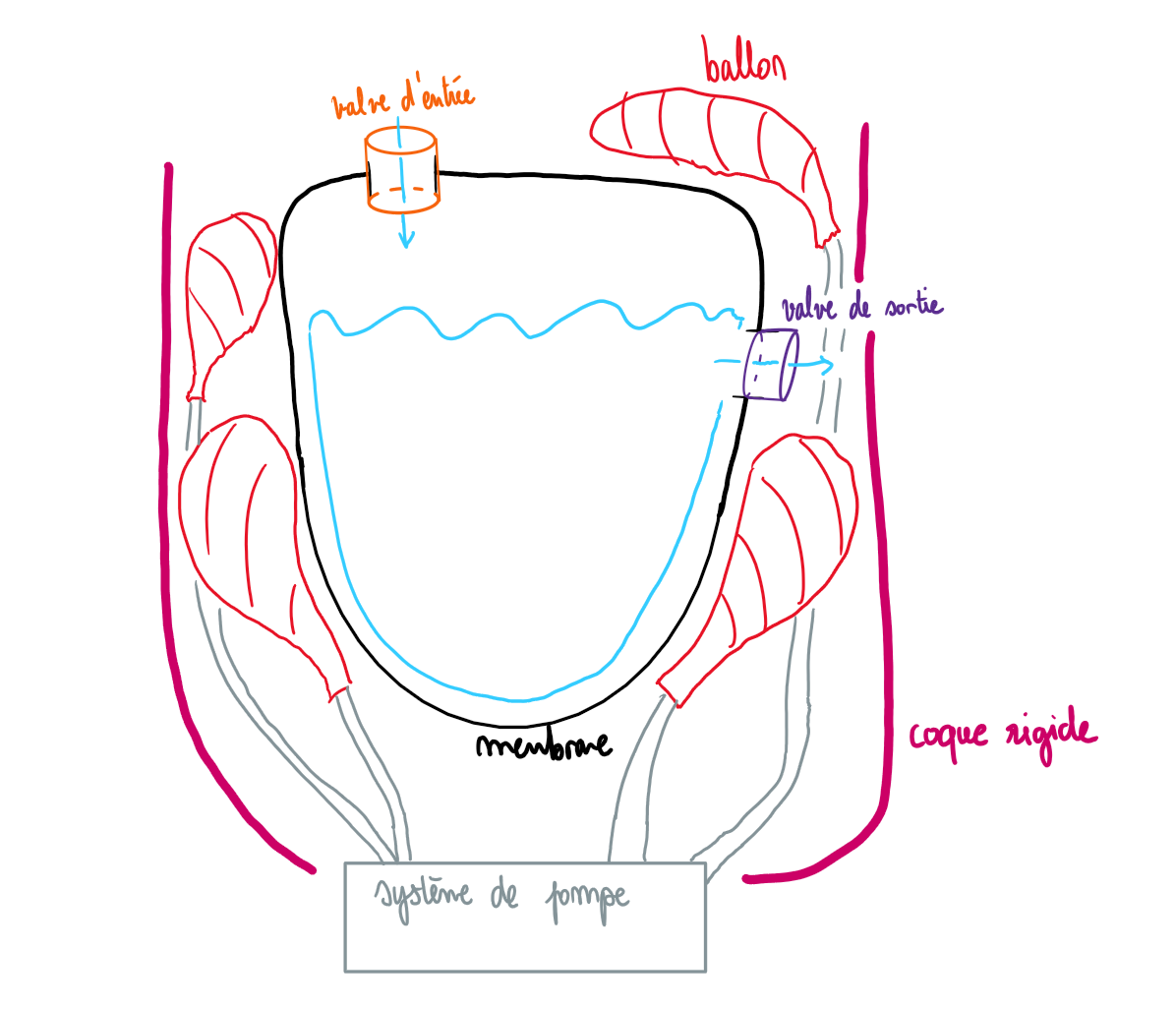 Nous avons décidé de créer un cœur/ une membrane en silicone grâce à un moule créé par une imprimante 3D ( à la base ). Le cœur humain est un organe complexe. Nous simplifions déjà le projet en ciblant qu’une partie du cœur : un ventricule muni de deux valves. Ces valves permettent l’arrivée et le départ de l’eau. De plus, un système de gonflage de ballons est mis en place afin d’imiter les battements de celui-ci pour créer des contractions pour réduire le volume intérieur de notre membrane et pouvoir projeter le liquide.