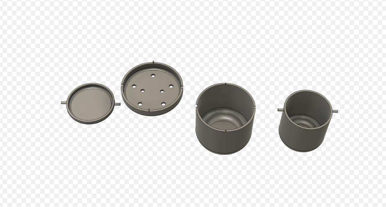 De gauche à droite : Partie intérieure du couvercle, partie extérieure du couvercle, partie extérieure du bas, partie intérieure du bas.